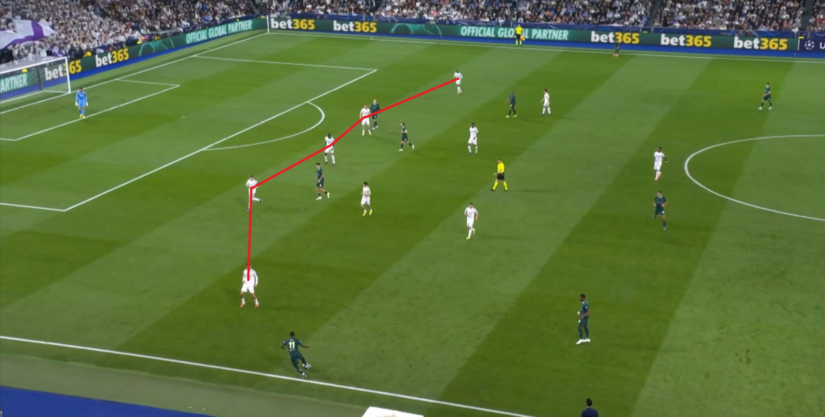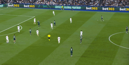 而在第17分钟,皇马则通过门前找到了边路的巴尔韦德,后者回敲之后,继续从罗德里和贝尔纳多-席尔瓦身侧完成了横移: