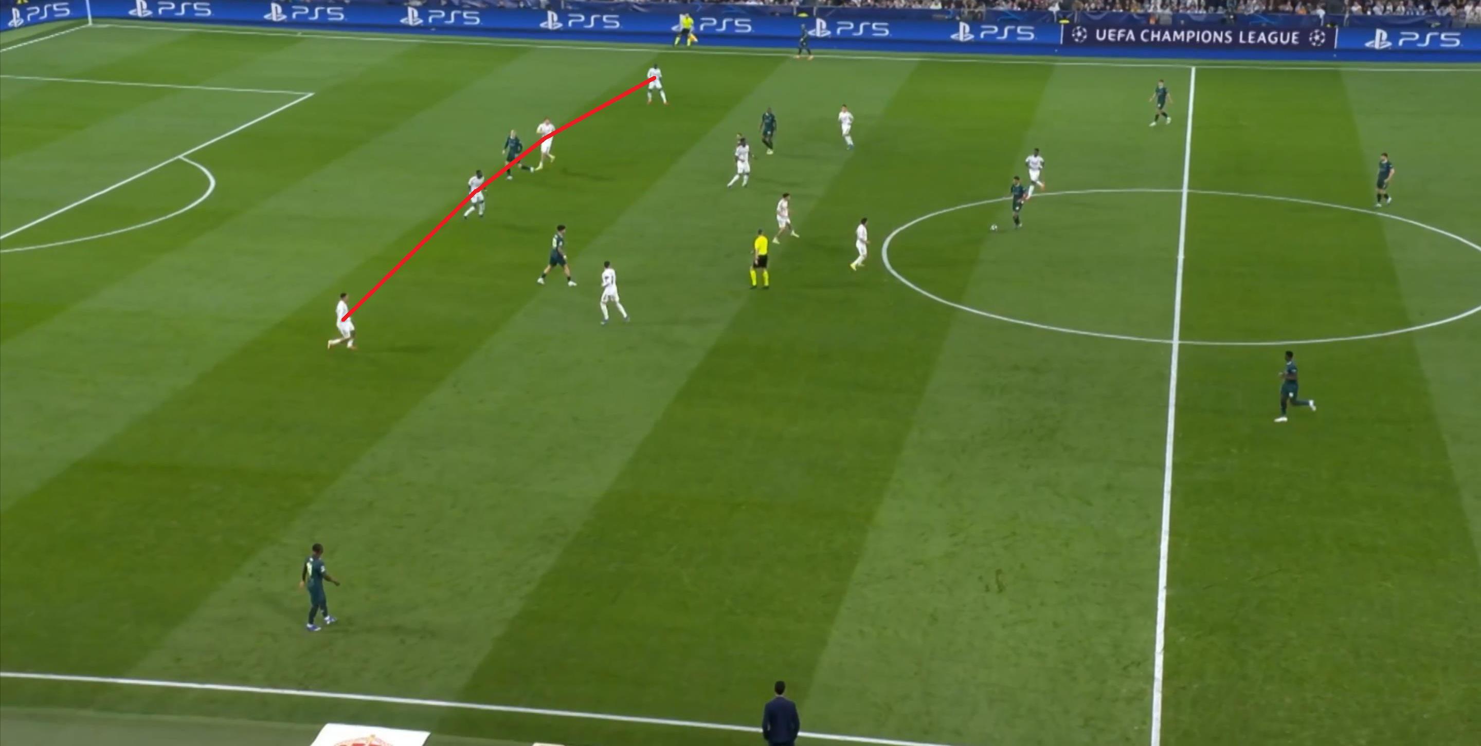 第27分钟,皇马从后场左路向前打出反击,尽管途中布拉欣-迪亚斯和维尼修斯未能形成合理传跑,但从弱侧插上的巴尔韦德,还是和再次穿越贝尔纳多-席尔瓦身侧的维尼修斯顺利衔接,从而打出了第二球: