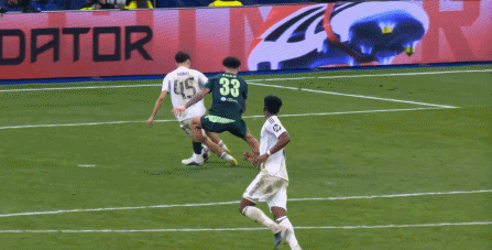 这是一个最大的危险信号,因为如果格伊开始撑不住了,那曼城的后场就没人能撑住了,于是到了第42分钟,皇马再次从左边路完成提速,打出反击,维尼修斯将球带到了前场: